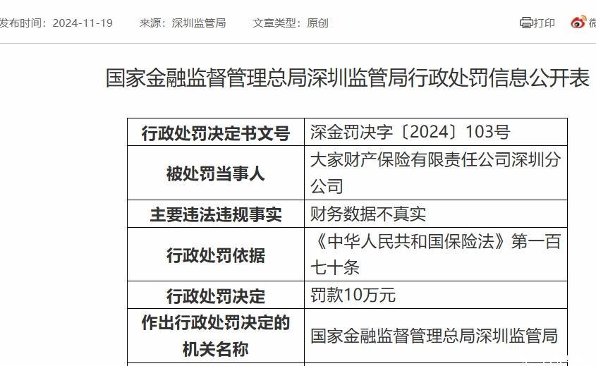 11月19日,国度金融监督处分总局最新的行政处罚信息表示,环球财产保障有限连累公司深圳分公司因“财务数据不简直”被罚金10万元。